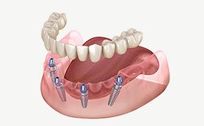 4本のインプラントで全体の人工歯を支える治療法です。少ない本数で広範囲の歯を補えるため、手術の負担を抑えつつ、治療期間の短縮にもつながります。見た目や噛む力も自然に近く、快適にご使用いただけます。